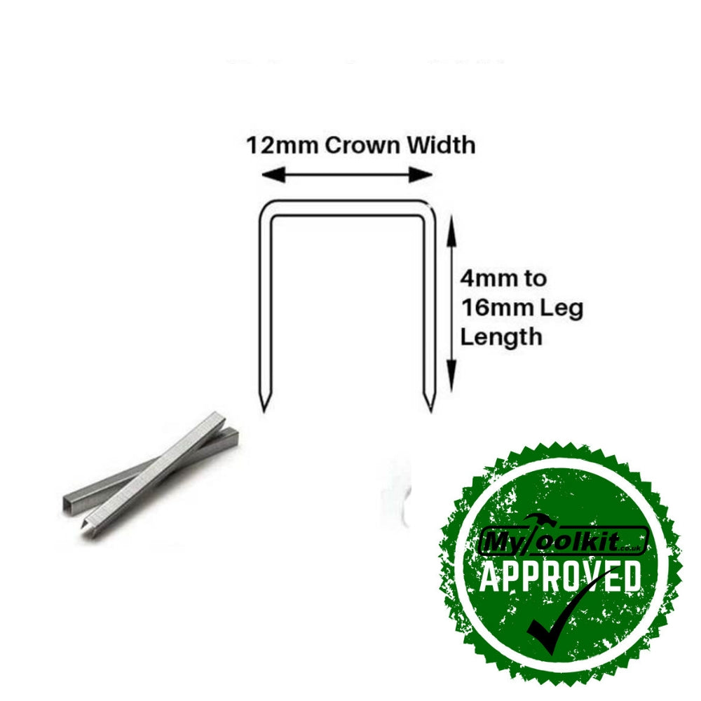 50 Series Staples come in leg lengths of 4mm, 6mm, 8mm, 10mm, 12mm, 14mm and 16mm. All leg lengths come in boxes of 5,000 staples aside from the 4mm which come in boxes of 10,000 staples. All 50 Series Staples have a Crown Width of 12mm.