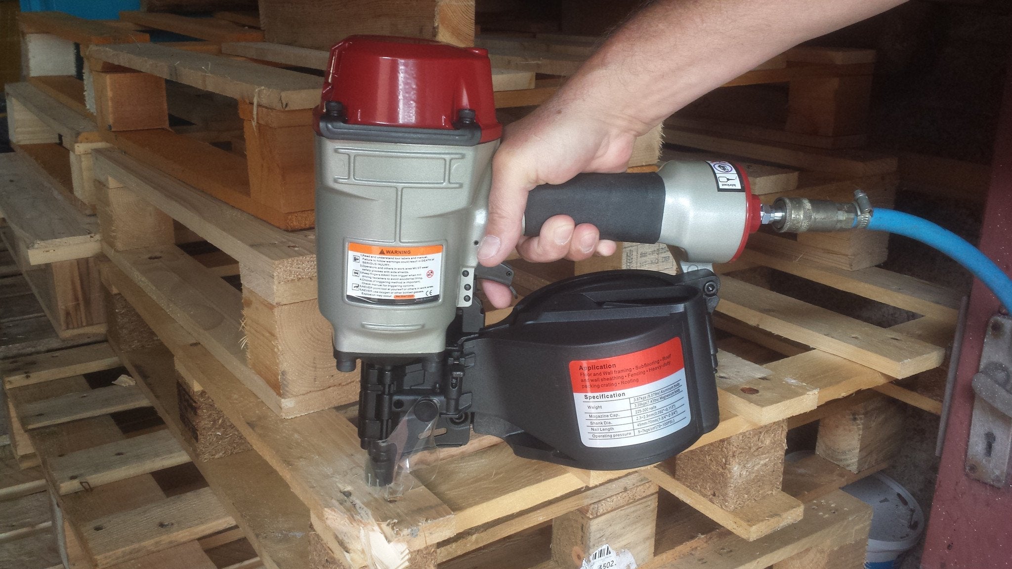 Presenting the air-powered Flat Coil Nailer or the CN70 as it’s more commonly known. This is a heavy duty coil nailer that drives nail lengths from 45mm through to 70mm, and takes nails with thicknesses ranging from 2.3mm to 2.9mm. This makes the CN70 perfect for packaging and pallet manufacture, and could also be used for some more heavy duty projects if desired.
