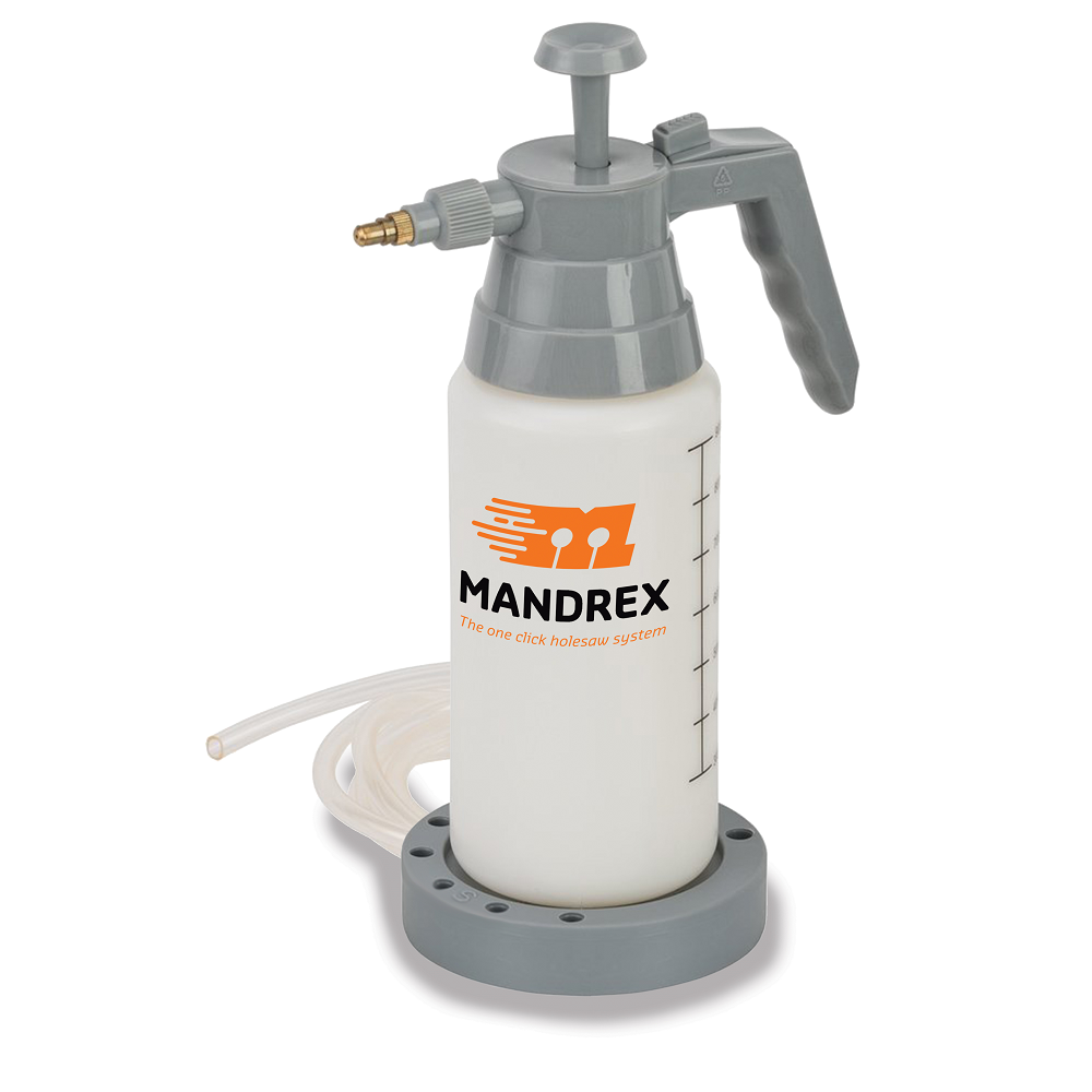 The Mandrex pressurized water spray bottle is used to provide watercooling to diamond Hole Saws when drilling tiles, etc.