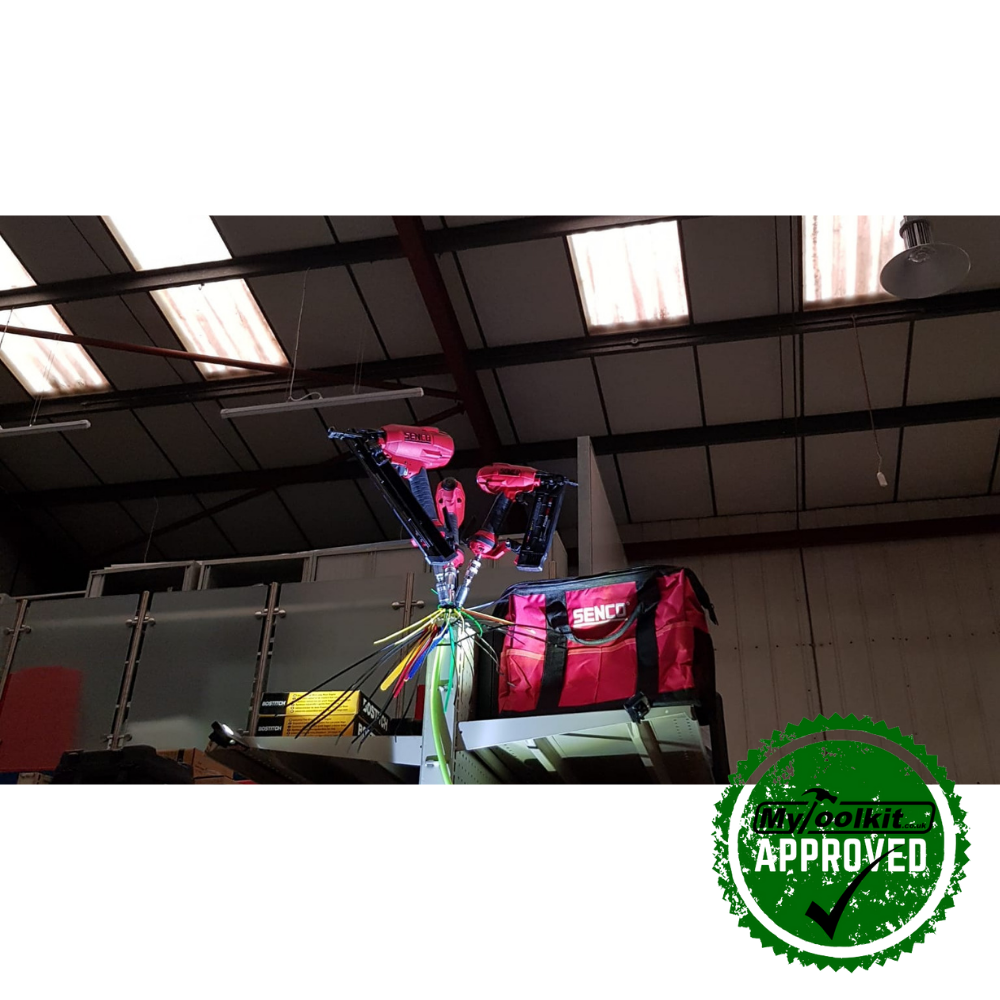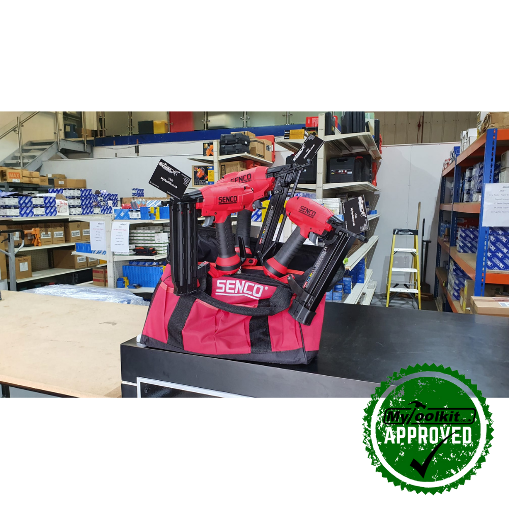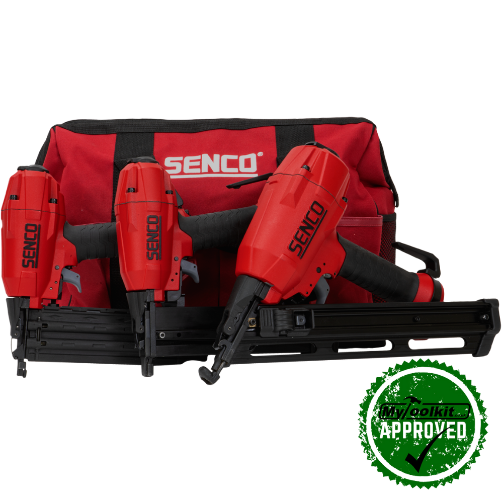 The Toolkit includes Senco’s FinishPro18BL 18gauge brad nailer (16-50mm), FinishPro35BL 15gauge angled finish nailer (32-65mm), and the SLS18BL 90series stapler.